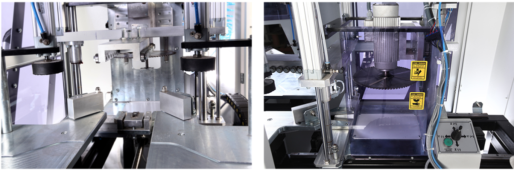 - Limpia automáticamente las rebabas formadas en las esquinas interiores y exteriores y en las superficies inferior y superior debido a la fusión en el proceso de soldadura de esquinas en los marcos de perfiles de PVC, con alta precisión y a alta velocidad.